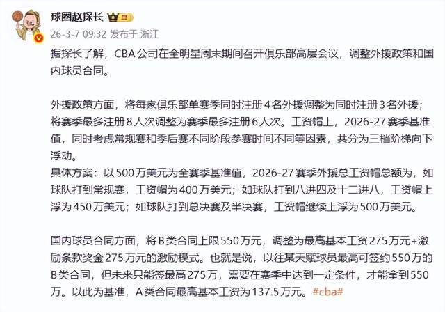 北京时间3月7日消息,根据著名博主“球圈赵探长”报道,CBA外援新政重磅落地!2026-27赛季起,外援注册规则与工资帽全面重构,俱乐部迎来“精兵简政”新时代。